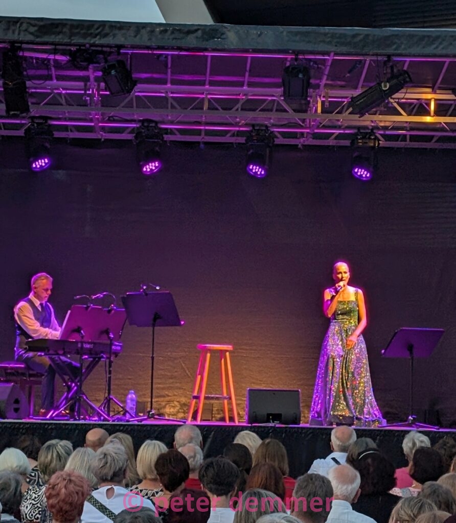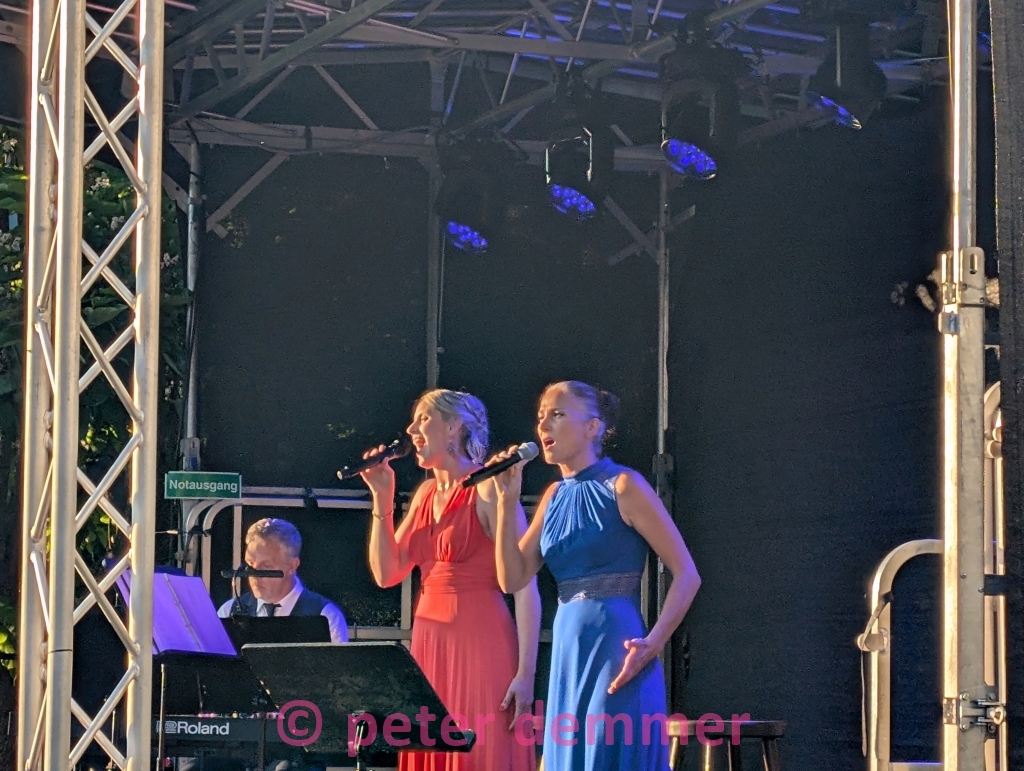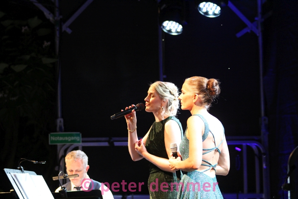 Das erste im Duett vorgetragene Stück auf dem vorabendlich sonnengetauchten Platz verklingt („Music“ von John Miles), und man ist sofort mittendrin in einem wohlig warmen, sommerlichen Klangteppich. Klavier, Stimmen, Sonne im Gesicht. Sofort ist alles weg. Die Werbeplakate an der Bushaltestelle – irgendwas mit Reifen. Die E-Mails. Die Müdigkeit. Auch etwaiger Zynismus. Einfach: weg. Charmant begrüßen einen die beiden Ausnahmesängerinnen von der Bühnenkonstruktion, und es ist sofort klar: Denen will man unbedingt weiter zuhören. Viel Musical wird der Abend bereithalten. Auch etwas Jazz. Und Pop. Filmmusik. Habe ich Musical bereits erwähnt? Und: Wicked!
