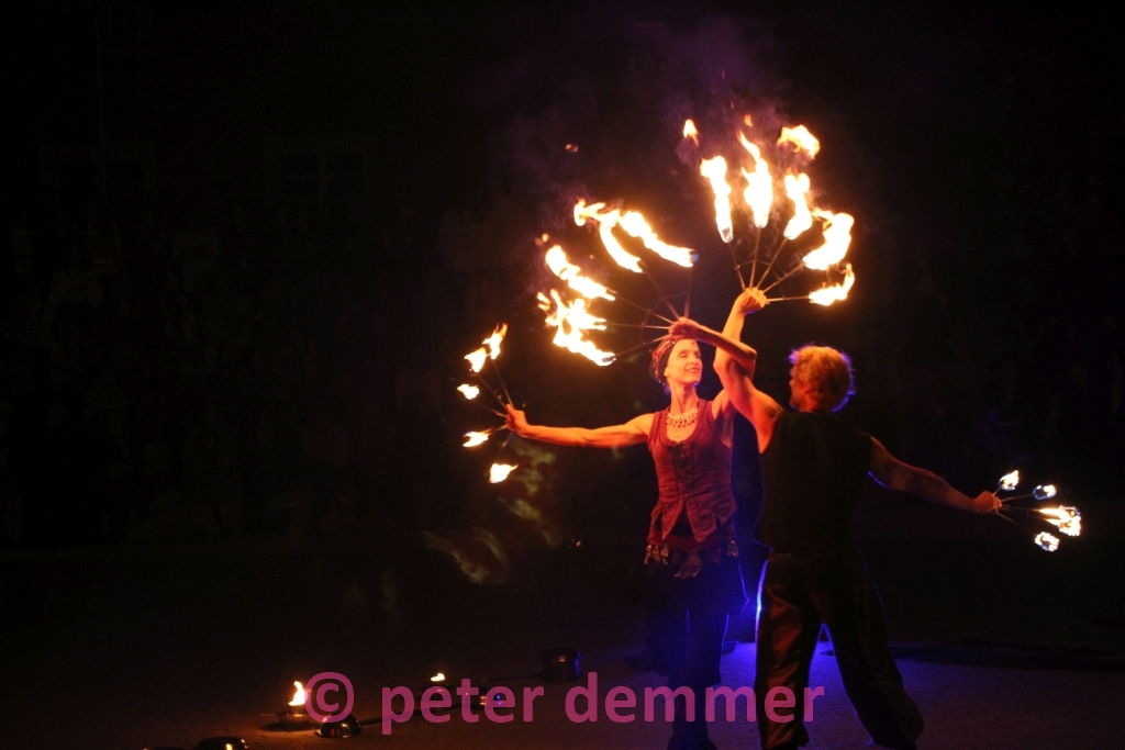 Seien es die lockeren Sprüche und das komödiantisch-musikalische Talent der beiden Künstler von „Forzarello“, die Menschen aller Altersgruppen begeistern, oder die Feuerkünstler von „Lux Eterna“, die bis spät in die Nacht die Flammen tanzen lassen – das Publikum ist gebannt.