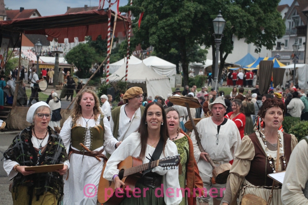 Und Kultur? Gibt’s natürlich auch – und zwar reichlich. Auf vier Bühnen, verteilt über das Mittelaltergelände, treten im Wechsel junge und alte, routinierte und frisch gestartete Künstler auf. Vor allem die regionalen Akteure der Rathaustanzgruppe bekommen viel Applaus – anmutig wie Mittelalter-Yoga in grüner Gewandung.