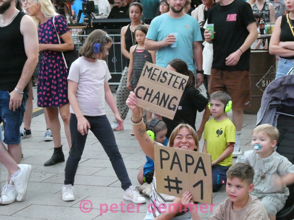 Die Kinder der Band mit ihren Schildern „Meister Chang“ und „Papa #1“. Man fragt sich, wie viele es wirklich sind – gefühlt könnte es eine ganze Fußballmannschaft sein. Der Indie-Nachwuchs in Deutschland ist jedenfalls gesichert.