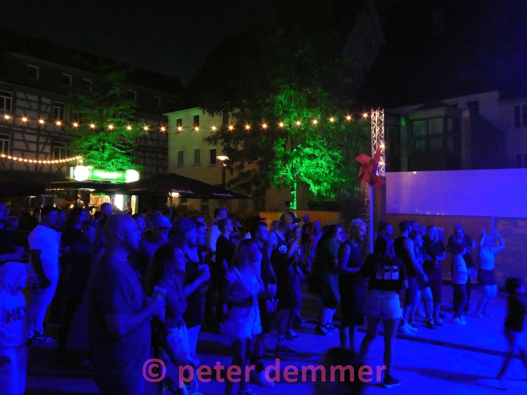 „Willkommen zuhause“, tönt es in der ersten Hook über den Ebinger Bürgerturmplatz. Die Band holt einen sofort ab und nimmt einen mit. Es ist warm, es ist trocken, und es sind Andy Walter am Schlagzeug, Chris Stifel an der Gitarre und Adam Schwenger am Mikro und mit Bass. In der Spitze sind es wohl rund 300 Menschen auf dem Platz, inklusive des mitgebrachten Fanclubs, die den drei Musikern lauschen. „Andy hat heute seine Kinder mitgebracht – alle!“ Bier in der Hand. Nicht die Kinder. Alles gut.