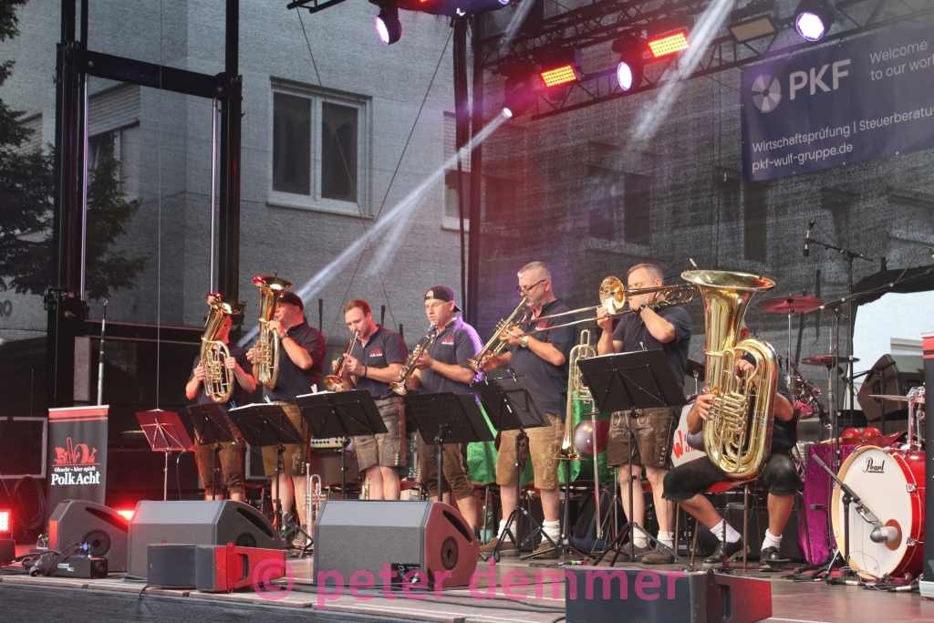Und pünktlich geht es los. Mit dem Volksmusik-Support aus Geislingen: PolkaAcht. Sieben Blechbläser und ein Trommler erobern den Marktplatz im Sturm. Wer langweilige Interpretationen uralter Standards erwartet, liegt falsch. Auf einem schmalen Grat aus traditioneller Polka-Logik, gepaart mit publikumsorientierter Darbietung – die Kaiser Musikanten haben hier wohl die eine oder andere Idee mitgegeben – rocken die acht den Platz. Sogar ein Mambo wird ausgepackt. Zwei Sets werden gespielt, bevor mit dem „Böhmischen Traum“ das Ende eingeläutet wird. Festzuhalten ist: Um 19:21 Uhr wurde das erste tanzende Paar gesichtet.