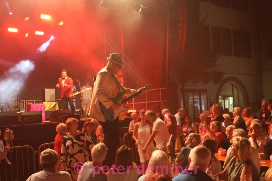 Und endlich beginnt es: das Wirtschaftswunder in Balingen. Genauer gesagt: der heutige Headliner Wirtschaftswunder startet mit dem Stück „Schöner fremder Mann“ im Original von der unvergesslichen Connie Francis. Und schubsdiewubs hat das Sextett das Balinger Publikum bereits ab dem ersten Ton komplett auf seiner Seite. Vorne die Sängerin Helga und der ebenfalls stimmgewaltige Oswald. Letzterer meint verwegen, er könne tanzen. Am Schlagzeug Dr. Sputnik, an der Gitarre der unglaubliche Eddie Schillinger, Jens von Eden an der elektrischen Orgel und schlussendlich Hans Albern am Bass. Aus dem Stuttgarter Raum kommen sie, und: die können echt was. Handwerklich auf höchstem Niveau, über 60 TV-Auftritte absolviert, katapultieren sie das Publikum direkt in das Nostalgie-Karussell, beginnend mit „Itzi Bitzi Strandbikini“ über „Drei kleine Italiener“ von Conny Froboess bis hin zur jungen Gitte, die einen „Cowboy als Mann“ will. Sie füllen ihr 100-Minuten-Set mit Schlagerklassikern der 50er- und 60er-Jahre. Und plötzlich steht Gitarrist Schillinger, einem Eddie Van Halen gleich, mitten im Publikum auf einer Bank und spielt ein Rock’n’Roll-Solo im besten Stil von Duane Eddy. Die Falten in Schillingers Gesicht sagen: „Er ist halt keine 39 mehr.“ Seine Finger auf dem Gitarrenbrett und sein Hüftschwung widersprechen: „Anfang 20, keinen Tag älter.“