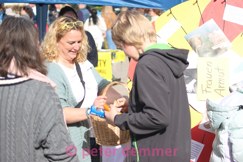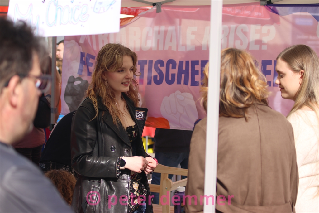 Und mittendrin eine junge Frau irgendwo hinten in der Menge, Anfang zwanzig, die trocken sagt: „Wenigstens wird heute keiner dämlich von rehbraunen Augen vor sich hinlabern.“ Zustimmendes Nicken. Gute Stimmung. Der Weltfrauentag hat begonnen.
