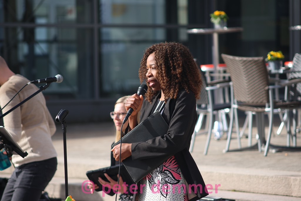 Für die Stadt spricht anschließend Stadträtin Evi Conzelmann, eine der beiden ehrenamtlichen Stellvertreterinnen des Oberbürgermeisters. Sie würdigt das Engagement der vielen Initiativen und betont die Bedeutung von Gleichberechtigung im Alltag.