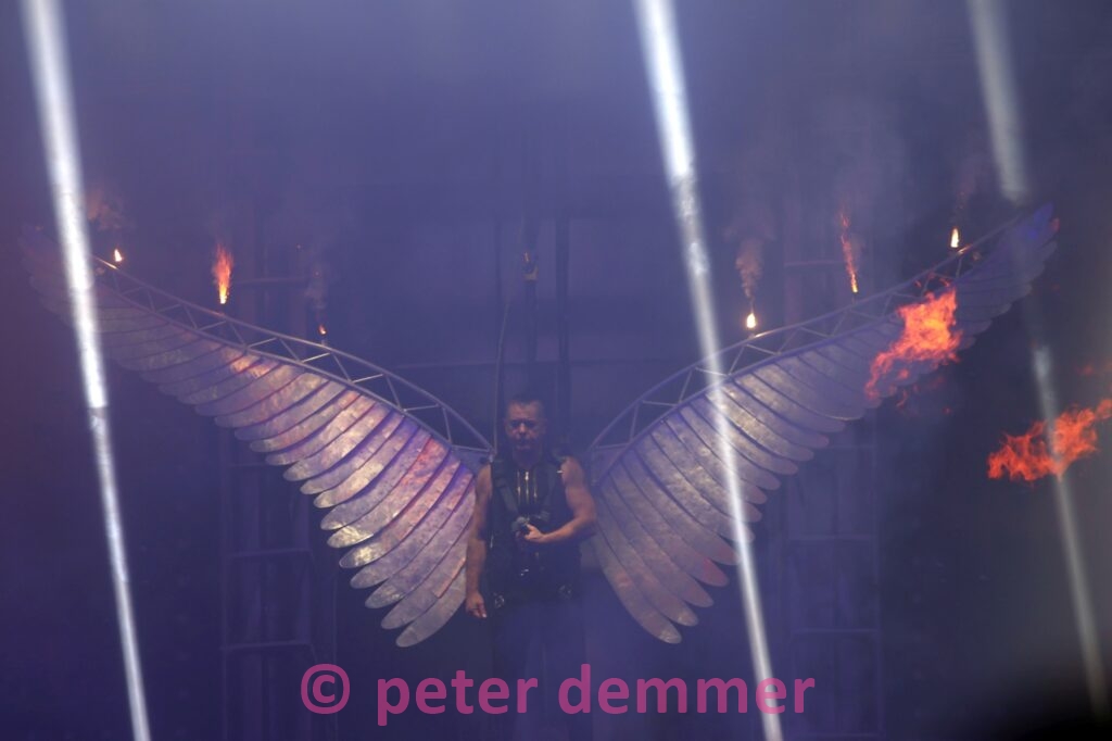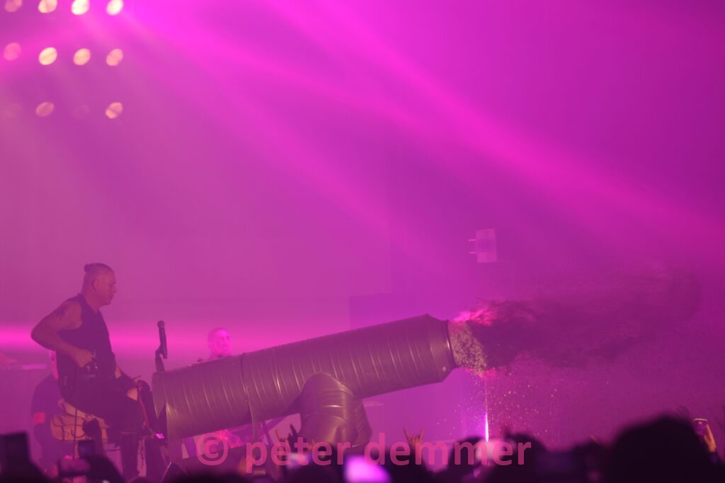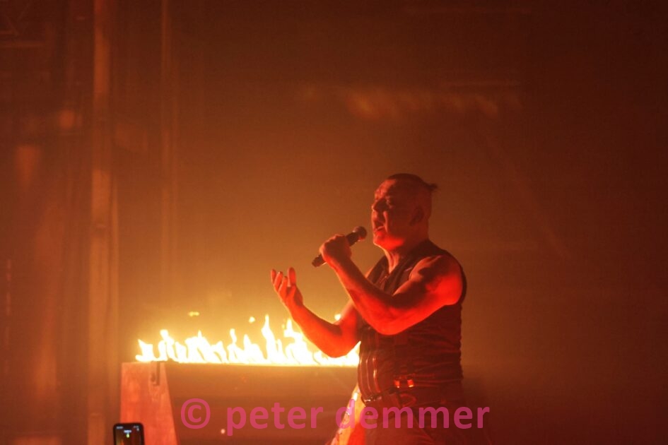 Das Timing der Band ist, wie der Rest der Show, nahezu perfekt. Jeder Lichtschwenk passt, jede Bandeinspielung ist absolut exakt. Und natürlich auch die Pyros. Hier wird nichts dem Zufall überlassen. Nicht einmal der Zufall selbst. Nun das Stück „Deutschland“: Die Bühne blutrot gefärbt, singt Heli Reissenweber, zu dem man mittlerweile wirklich „Till“ sagen möchte, von einem schwierigen Verhältnis zum Heimatland. Dies lyrisch schlau verwoben. Die Bridge „Deutschland über alles“ singt trotzdem manch einer in den ersten Reihen dann aber doch, den ironischen Bruch nicht verstehend, zu frenetisch und begeistert mit. „Solche Typen gibt’s mittlerweile halt überall“, meint eine junge Frau kopfschüttelnd.