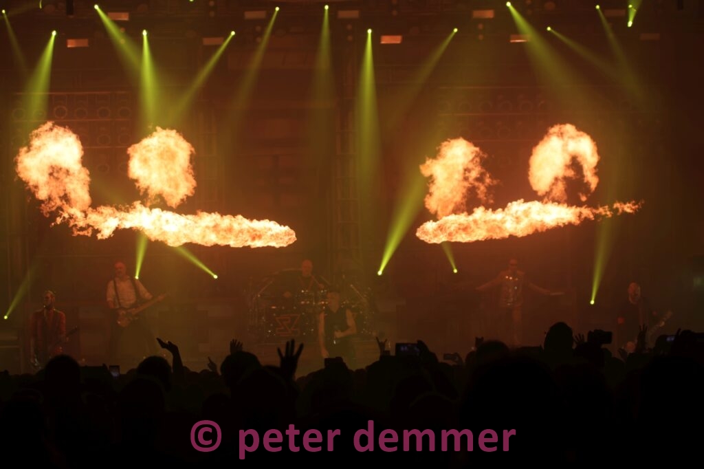 Mit dem Stück „Reise, Reise“ beginnt der lustige Reigen. Der Sound ist okay, wird aber im Laufe des Abends noch besser. Die Bühnenaufbauten links und rechts, die Traversen und Lichtkonstruktionen sind massig. Man versteht schnell, wieso die Band erzählt, man müsse schon immer mit zwei Trucks unterwegs sein. Auch die Bühne selbst ist vollgestellt mit allem möglichen Feuerwerksgerümpel.