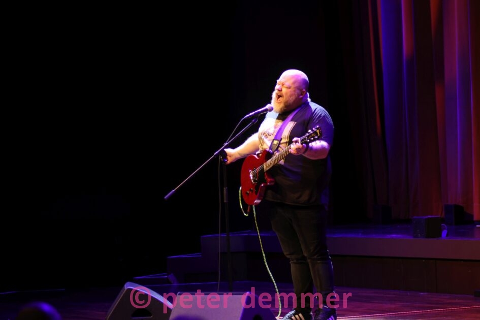 Er schlurft auf die Bühne. Pünktlich um 19:30 Uhr. Dunkle, leicht fleckige Hose, Dinosaurier-Shirt, schwarze Adidas – und alles irgendwie eine Nummer zu klein. Glatze und ein zotteliger Bart, der im Nikolausranking eine 4 von 10 bekommen würde. Er schnappt sich seine Gitarre. Eine rote Gibson. Spielt sechs, sieben leicht angezerrte Töne, geht den einen Schritt hin zum Mikro und zeigt mit seinen ersten paar gesungenen Worten, wieso die ganzen Leute heute hier sind: was für eine Stimme.