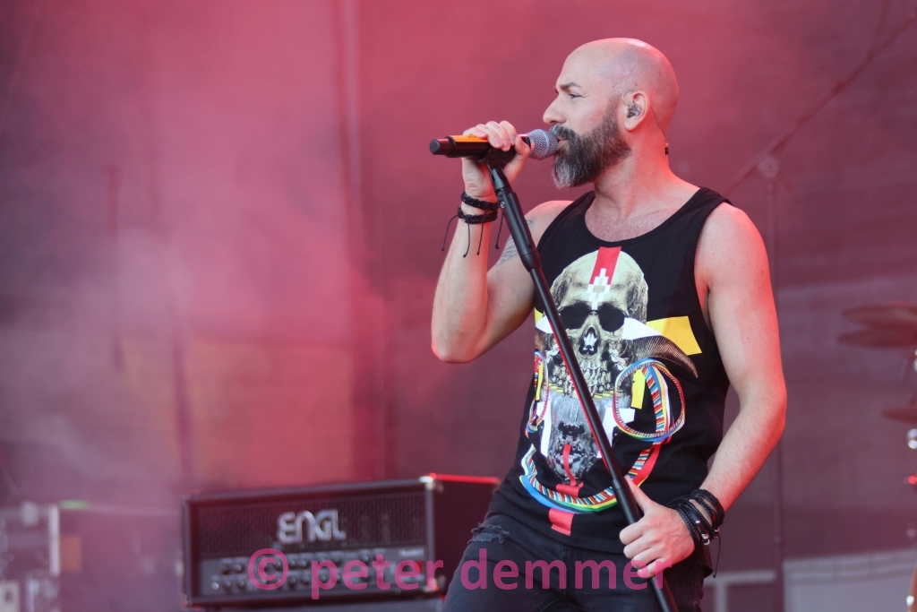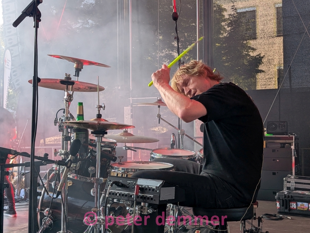 Kurz nach 18 Uhr. TakeTwo. Zwei Akustikgitarren, eine Mission: die Leute zum Mitwippen bringen, bevor das erste Rotweinschorle wirkt. Sie schaffen das – mit Gitarren, die klingen, als hätten sie ihr Leben lang auf diesen Abend gewartet. Zwischen Fairytale Gone Bad und dem wundervollen Shadow of the Day wird gecovert, was das Zeug hält – aber eben akustisch. Die Finger von Alfonso Gerardi fliegen dabei nur so über das Griffbrett.