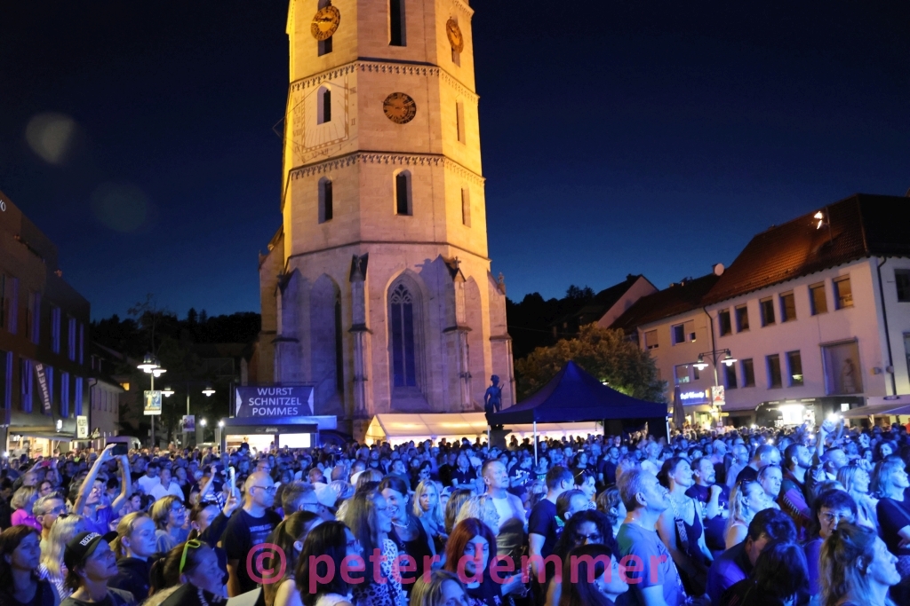 Kulturfestival, erste Woche, Freitagabend. Kein Regen – im Gegenteil: Der Wettergott liebt Balingen. Heute: mit dem Besten, was die Stadt rockkulturell zu bieten hat. Oder besser gesagt: das jährliche Klassentreffen der lokalmusikalisch Kreativen aus der Kreisstadt. Gegossen in schweres Metal. Alles, was Rang und Namen in der Musikszene vor Ort hat – und nicht gerade beleidigt ist, dieses Jahr nicht selbst auftreten zu dürfen – findet sich auf dem Balinger Marktplatz. 3500 Menschen vielleicht. Eher mehr. Und sicher alle, die in Balingen je eine Gitarre in der Hand hielten – oder es sich zumindest mal fest vorgenommen hatten.